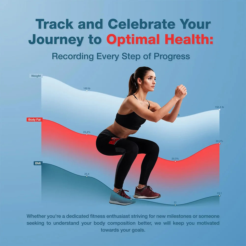Smart Body Composition Scale with App Sync Comprehensive Health Tracking: The weight scale measures fat, water, bone mass, muscle, visceral fat, and metabolism, providing a complete overview of your body composition. Measures up to 180kg Smart Connectivity: This smart scale connects seamlessly to your app via Bluetooth-Compatible, allowing you to track your progress and set goals effortlessly. Advanced Metrics: The wireless body fat scale offers precise measurements from 0.2 to 180 kg, with a high-definition screen that clearly displays decimals, ensuring accuracy for all body types.Sentence 4. User-Friendly Design: The body composition analyzer features non-slip rubber pads for stability and USB charging for convenience, making it perfect for daily use.Sentence 5. Clear Display Anytime: The smart body fat scale comes with an LCD screen that automatically adjusts brightness for clear visibility during the day and night, and it even displays temperature for added functionality.